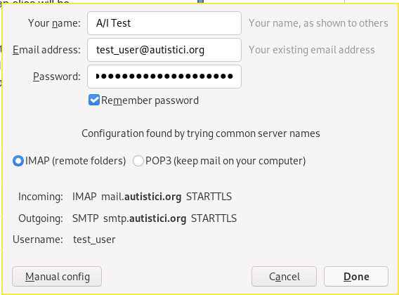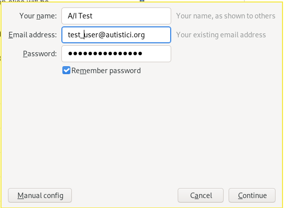 Clicking on Continue will trigger Thunderbird to search for the mailserver. In case of success the box will appear like this