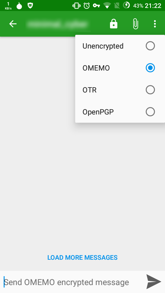 The first time you open a dialog box with a user in your contact list, press the lock in the above menu and select “OMEMO”.