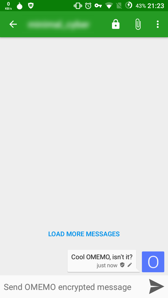 Conversations implements another protocol called OMEMO for enabling end-to-end encrypted communications. Unlike OTR, OMEMO provides some interesting functions, like encrypted group chats, message synchronization among different devices and off-line delivery. Let’s see how to use it.