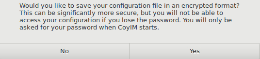 CoyIM gives you the chance of saving your client configuration file in an encrypted mode. In this way, should someone illegitimately access your computer, they will be neither able to see your username, nor your login password or the chat server you are using. If you choose to enable this option, click on “Yes”.