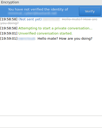 As explained in the introduction of this tutorial, CoyIM will automatically encrypt the content of your conversations with OTR and will not allow sending unencrypted messages: this means that your contact must necessarily use an XMPP client that supports OTR at the same time.