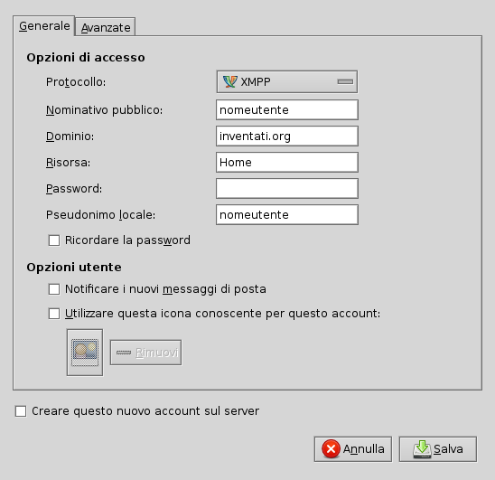 In our example we will be configuring Pidgin for the user: ’nomeutente@inventati.org'.
