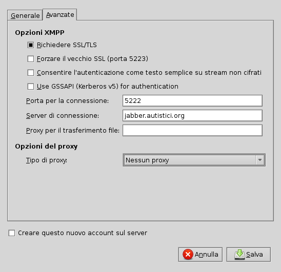 Now you can move to the “Advanced” tab Mark the checkbox “SSL/TLS” and fill in “5222” in the “Connection Port” field, and “jabber.autistici.org” in the “Server” field. Save your configuration and you are ready to go.