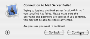 - VERY IMPORTANT! If you plan to set up secure connections, do not enter your correct password, because it will be transmitted over the internet in “clear text”. Enter an incorrect password here. You will occasionally get a dialog box requesting your password when mail attempts to check your mail. Ignore it until you finish setting up the secure connections. Just hit cancel when these messages appear.
