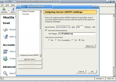 - The same operation should be repeated for the SMTP, the server managing the sending of emails. Click on Outgoing Server in the lefthand window and write “smtp.autistici.org” in in the Server Name window and your email address in the User Name window.Then check the SSL option and verify that the Port is listed as “465”. If you selected the TLS option then the Port option can be listed as “25”.