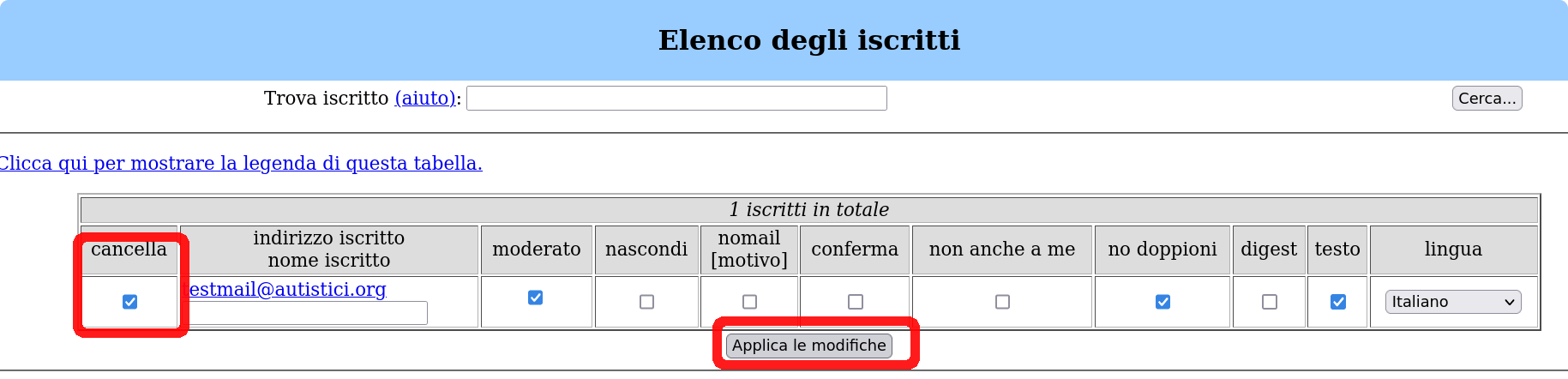 In the Membership List subpage you’ll find a list of all the mail subscribed to the newsletter along with a series of option for each one of them: