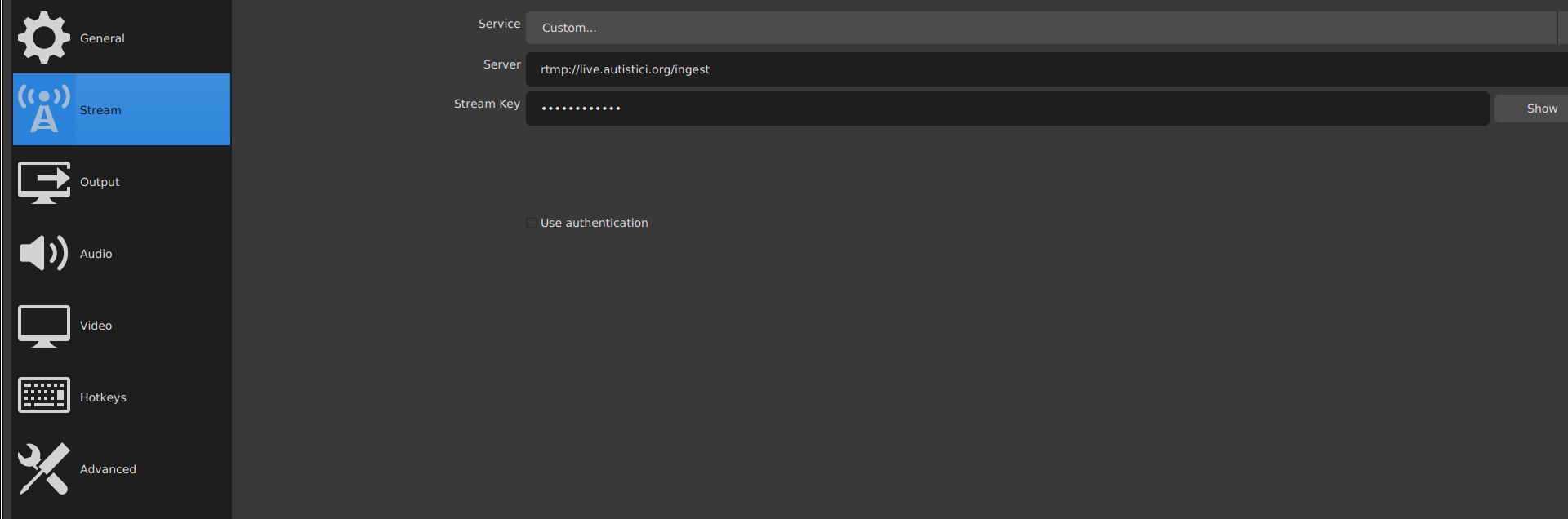 To stream on live.autistici.org, we recommend you use OBS Studio following these instructions for connecting to the streaming server: