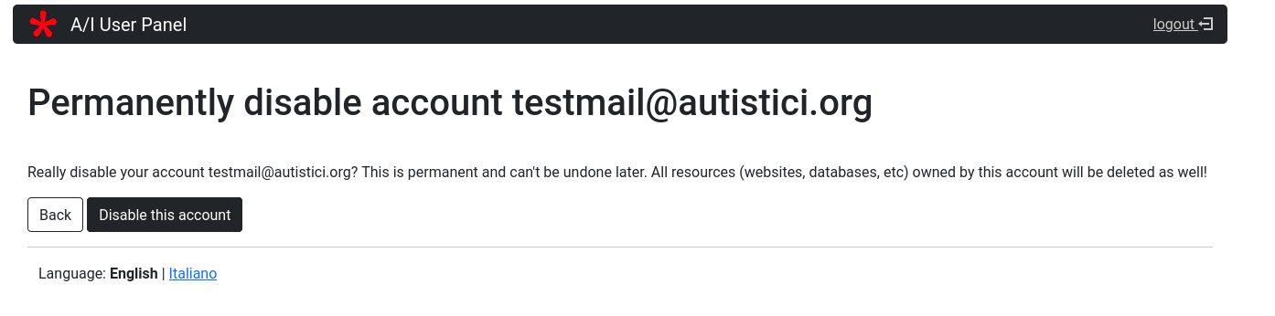 Clicking on Account management and then the red button Disable Account a page will open: