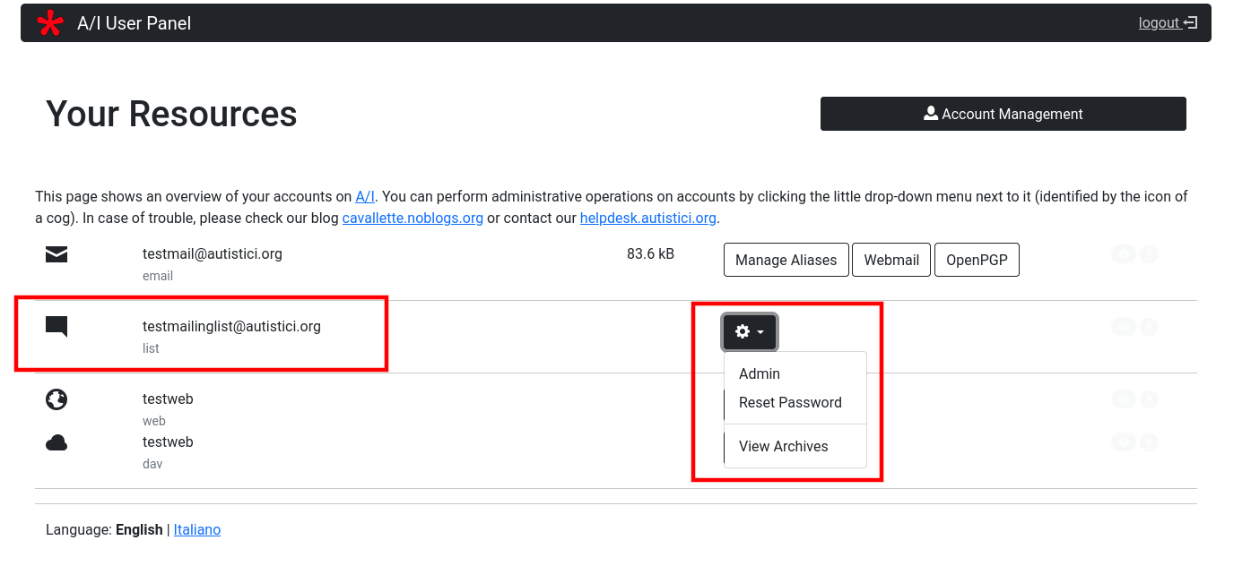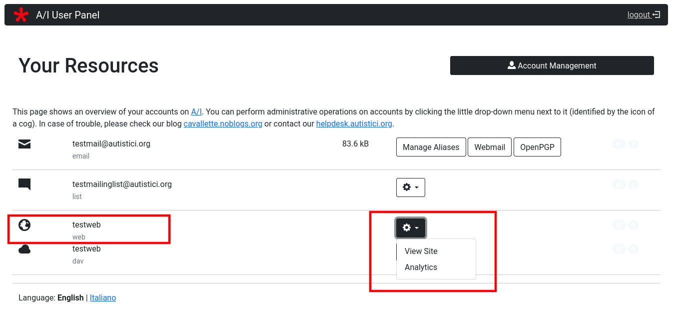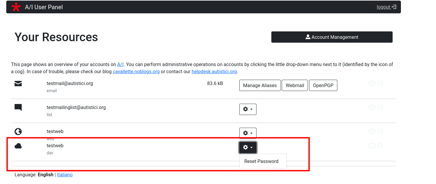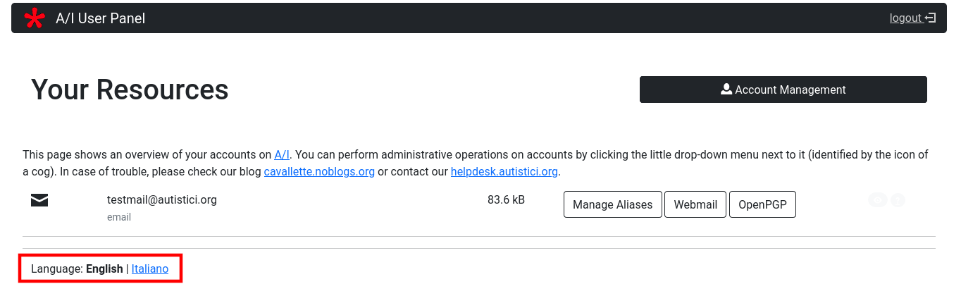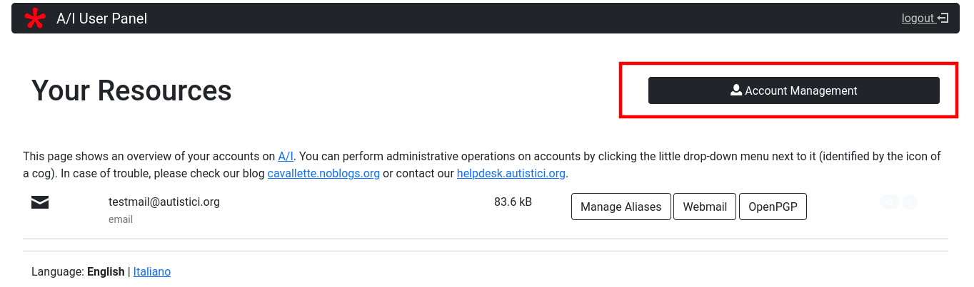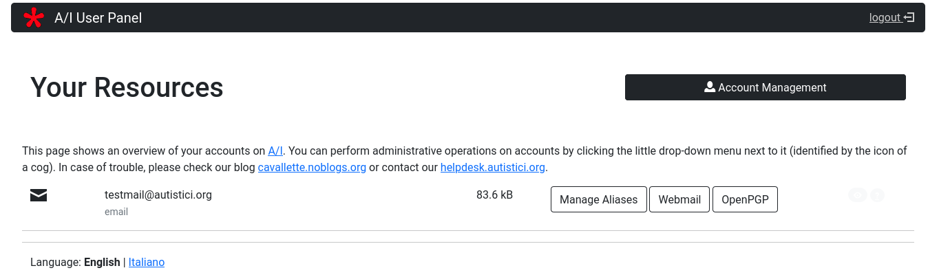 If you requested to A/I something more than a simple mailbox address then your User Panel will be somewhat more complicated. If you are managing some website on A/I servers, your account management area will be enriched by a new section.