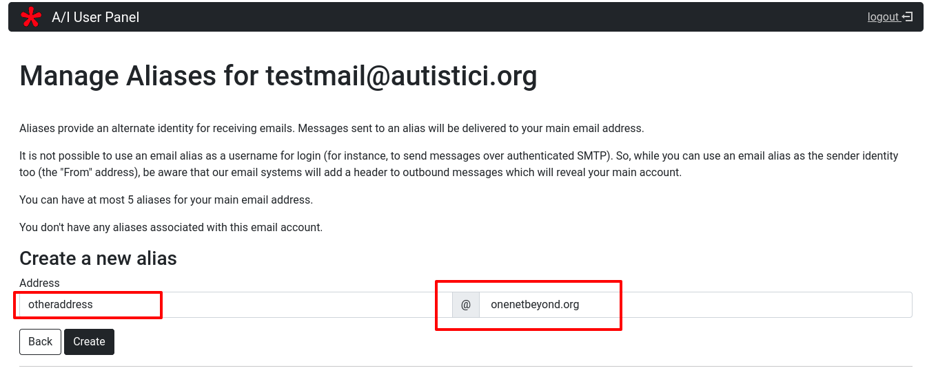 Once you click you will be directed to a form where you can fill the alternative address you wish for and click on the Create button.