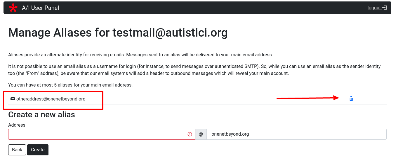 Now your mailbox management area changed a bit and you can find your alias next to your mailbox address. If you already have an alias and want to remove it, you simply have to click on the trash sign next to the address you wish to delete. (see red arrow in the next image)
